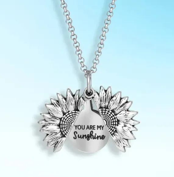 Inspired by the song "You are my sunshine", this necklace is crafted by artisans in metal with the message "You are my sunshine" hidden in a sunflower locket necklace that is simple yet fun and perfect for everyday wear to make you even more attractive, Fun, beautiful and attractive.