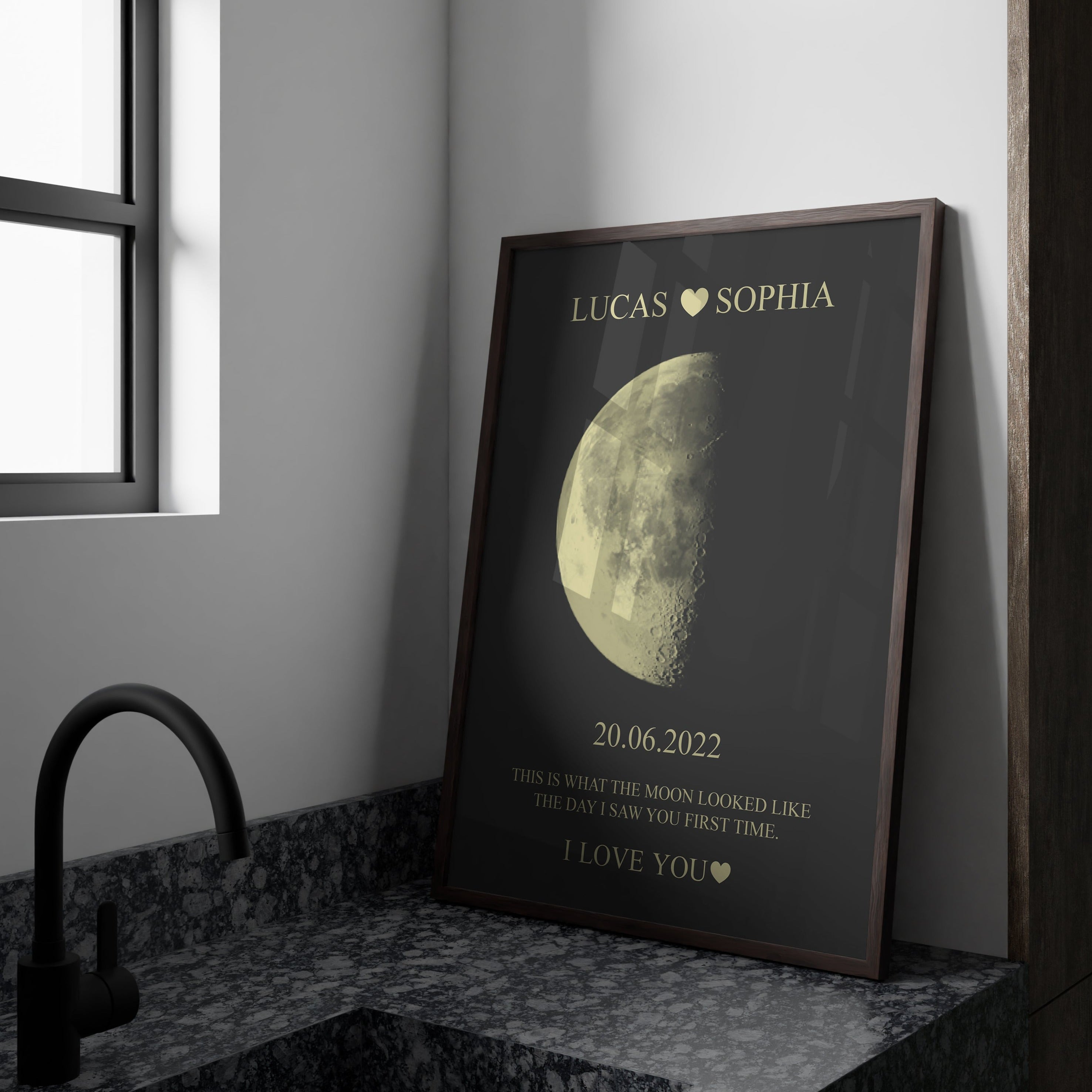 Introducing our Moon Phase Frame® – a personalized creation that commemorates special moments under the enchanting glow of the moon. With its celestial design, this frame elegantly showcases a custom moon phase of your chosen date, accompanied by a custom message and personalized header names, creating a celestial keepsake of your cherished memories.