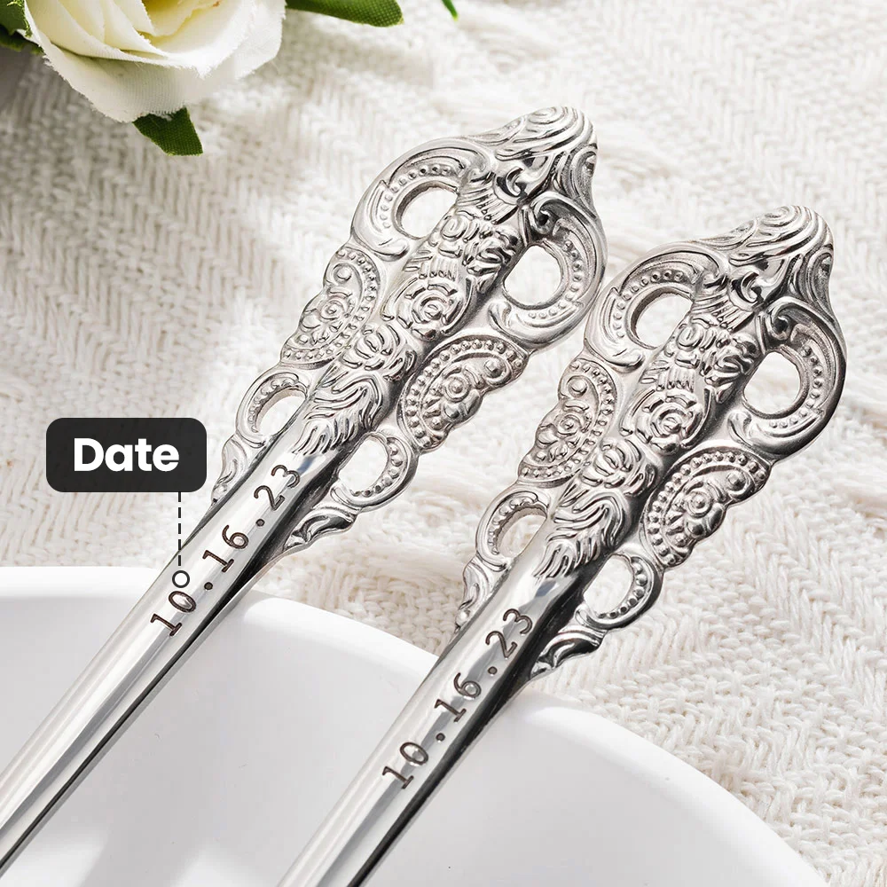 [PERSONALIZED ENGRAVING]: You can customize the names or titles of the couple on the front of the fork and the date with special meaning on the fork handle to make this pair of forks extra special. Laser engraving technology results in a refined and long-lasting look, making it a treasured keepsake for years to come.