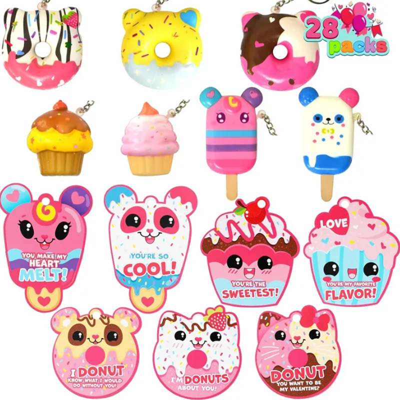 This Valentine's Day, why not give a cute and creative gift? This 28-pack of Valentine's Day dessert-shaped keychains with a squeeze-and-play function, complete with a Valentine's Day card, is the perfect choice for friends, lovers, family, or even as a gift exchange in class! Each pack of toys is full of sweetness and fun, bringing joy, laughter, and surprises! 🎉🎨